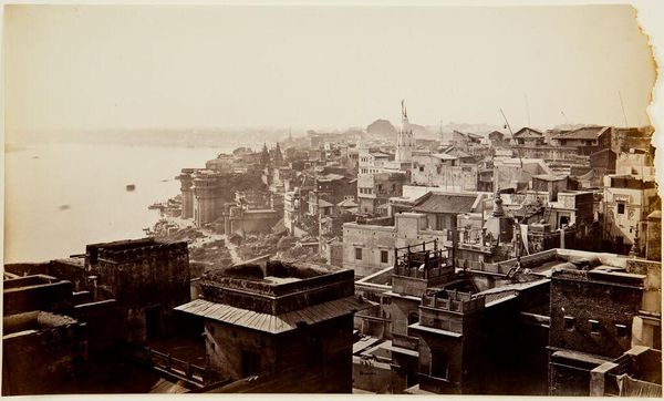 Curator: This albumen silver print by Samuel Bourne captures Benares, featuring the Great Mosque of Arungzebe and adjoining ghats. The image is part of the Harvard Art Museums collection. Editor: The sepia tones imbue the scene with such a timeless, almost melancholic air, don't you think? The dense composition, contrasting architecture with bustling river activity, is striking. Curator: Bourne operated a commercial studio, and his work contributed to the colonial-era construction of India as an exoticized, knowable place for Western audiences. Note how the ghats, steps leading to the river, are teeming with life, almost staged. Editor: Precisely, those figures performing rituals and mundane tasks serve as potent symbols of purification and cyclical existence. The minarets towering in the background loom as a symbolic counterpoint. Curator: Indeed, the mosque's presence speaks to the complex socio-political dynamics of British India, representing both power and potential tension in the landscape. Editor: The Ganges itself, rendered so placid here, becomes a powerful emblem of continuity. It ties together the spiritual and the everyday. I find the photograph so compelling in its ability to capture a moment in time that seems to stretch into eternity. Curator: I agree; seeing the photograph as a moment in history, we are invited to reflect on how representations shape our understanding of other cultures and our own place in the world.