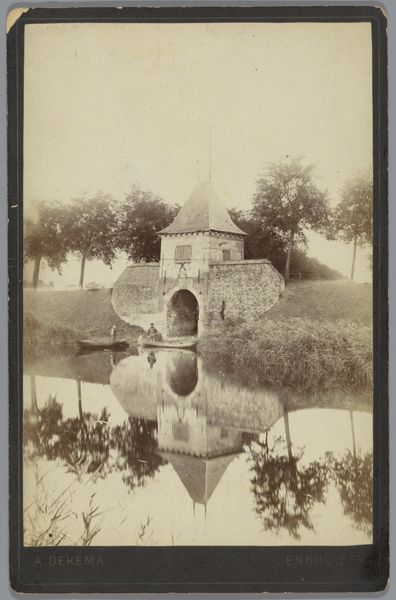 Curator: A still moment captured in time, isn't it? What feelings arise for you when you view this early photograph? Editor: A sense of calm and reflection. The stillness of the water, perfectly mirroring the gatehouse. It’s like seeing two worlds in one frame. The reflections carry potent symbolism, particularly around the ideas of memory. Curator: Indeed. The Rijksmuseum holds this piece, entitled "Gezicht op de waterpoort de Oude Gouwsboom in Enkhuizen", which translates to "View of the Oude Gouwsboom Water Gate in Enkhuizen." It was taken by Albert Dekema sometime between 1865 and 1896. Notice how photography was capturing and shaping Dutch identity during that era, immortalizing its historic waterscapes like this gate. It's more than just an image; it’s a record of urban development, really. Editor: The gate itself certainly looms large, both physically and metaphorically. Gates often represent transitions, passages from one state to another. Here, coupled with the reflections, is this image inviting us to consider time passing or cycles repeating? And how the town continues around it? It really emphasizes ideas of journeys and protection. Curator: I agree wholeheartedly. Beyond its thematic strength, its function in that local moment fascinates me. Water gates controlled access and were critical for defense and trade. It represented the town's power and independence and of the rise of landscape photography, it allowed more public participation in these cultural conversations. Editor: The composition, almost symmetrical, emphasizes the strength and stability of the structure. It’s very classically composed but tinged with a more Romantic focus on mood, don’t you think? Even with the tonal constraints of the early photography. Curator: It balances nostalgia for the past with this modern need to show off new national icons. Dekema subtly asserts Dutch civic pride. Editor: An everyday scene rendered with this quiet formality encourages me to wonder, What did it mean to be Dutch, to belong, in this specific locale? The gate then functions almost as a historical marker, rooted deeply in collective identity. Curator: So, photography and the city gate end up acting together as symbols of the national Dutch spirit here. Very interesting, what a lens does for cultural pride! Editor: Absolutely. It adds layers to what at first appears a simple scenic image.