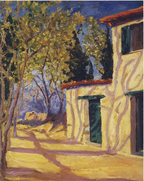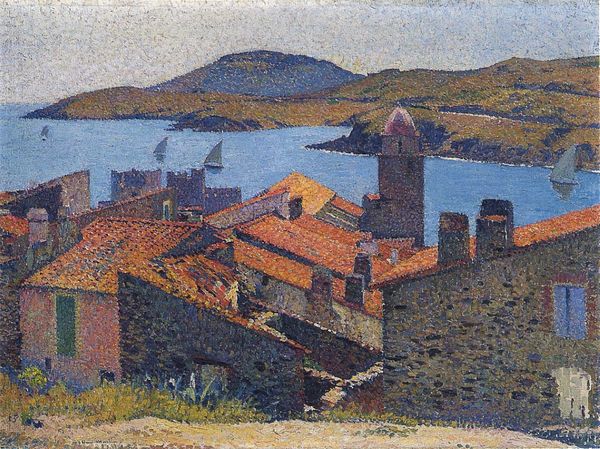 Henri Martin painted this village scene with oil on canvas, using a pointillist technique of small, distinct dots of color. The rough, textured surfaces of the buildings are built up with countless touches of the brush, mimicking the labor of the stonemasons who originally built these structures. The very process by which Martin made this painting relates directly to the scene he depicts. The sun-baked stones and tiled roofs are rendered with the same painstaking approach that would have gone into their construction. Martin's technique is labor-intensive and time consuming, not unlike the traditional craft practices he represents. Rather than emphasizing the artist's genius, this method foregrounds the value of repetitive, skilled work. Martin elevates these everyday forms of labor by engaging with the same kind of dedication and skill in his art. It's a testament to the fact that truly seeing any object means understanding how it was made, and how that making carries cultural significance.
