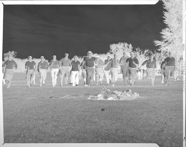 Curator: This gelatin silver print by Martin Schweig captures a seemingly candid moment: eight children preparing for a tug-of-war, with a baby in the foreground. Editor: It feels…unsettling. The inverted tones give it an eerie, almost dreamlike quality. The children are frozen in anticipation, a kind of ominous calm before the storm. Curator: The composition is interesting, isn't it? The children are grouped around a large tree, which serves as a central anchor, almost like a silent witness to their game. Editor: The baby is the most compelling figure. Are they a witness, too? Or are they a player in a game they don't understand? This photo resonates with questions of power and innocence. Curator: It's intriguing how Schweig captures what appears to be an everyday scene, yet imbues it with this uncanny feeling. It prompts us to consider the power dynamics even in children's games. Editor: This photograph really underlines how art can hold a mirror up to society, reflecting not just what we see, but also the complexities and the shadows beneath the surface.
