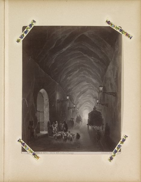 Curator: The sepia tones and theatrical lighting in this photograph, "1141 Piedigrotta Napoli" by Giorgio Sommer, transport me. It dates from somewhere between 1893 and 1903. Editor: It’s… cavernous. The sheer scale and the way the light seems to emanate from a distant point give it a sense of forced perspective, almost as if everyone's converging on the light. What was Sommer aiming for here? Curator: Consider Naples during that period—a society grappling with massive economic disparity. Sommer, catering to the burgeoning tourist industry, was actively constructing a narrative about Italy through photography. The photograph itself is a manipulation of charcoal drawings. Look closely, and you'll see the drawn-in people. Editor: Right, so the labour went into constructing the *idea* of a place. But this feels performative, a kind of social tourism for consumption, with its implied division between the viewers and the observed, the tourist versus those that they tour through. It’s perpetuating certain gazes… Curator: Exactly. It reflects how commercial photography blurred boundaries by turning lived reality into constructed images that bolstered power dynamics. The actual manufacturing of the image required labour: gathering models, processing chemicals, and selling prints to the privileged class, of course. Editor: And, what of those models? These folks aren’t generic subjects. The inclusion of armed men, for example, or groups being watched… all have cultural roots that affect the distribution of representation of Italian national identity at the time. It asks whose lives, labors, and social realities are legitimized through images like these? Curator: We see these themes reflected across the photographer's entire body of work— always asking us to think critically about the visual representation of cultures, especially the artist's means and material impact in creating such a constructed sense of place. Editor: Right. This isn't a window into history; it is a very constructed scene, a product intended for sale and consumption. It challenges us to consider what power structures it affirms and which it possibly obscures.