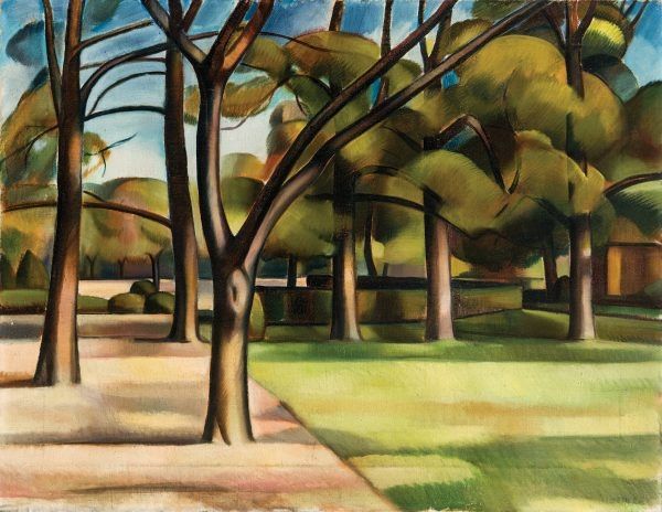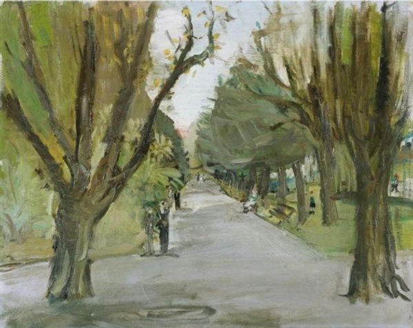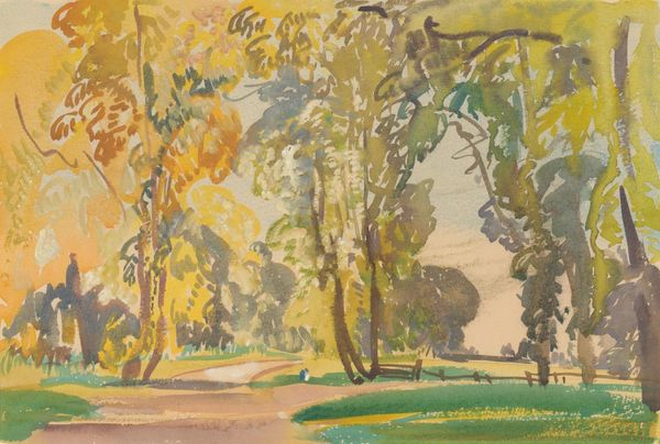 Editor: Here we have "Riverside" by Boris Grigoriev, painted in oil. The way the road leads your eye into the composition is compelling. What stands out to you? Curator: Notice the tension between the ordered, vertical tree trunks on the right and the more loosely rendered structures on the left. This opposition creates a dynamic visual field. Consider also the chromatic relationships. Editor: Can you expand on that? I’m intrigued. Curator: Certainly. Observe how the reds and oranges of the rooftops and autumn foliage are subtly echoed in the road itself, creating a cohesive yet vibrant surface. This is a clever use of complementary colors. What do you think that accomplishes in the composition? Editor: I suppose that without those warm hues reappearing throughout, the painting might feel disjointed, as if the left and right sides don't relate to each other. The artist appears to use that palette choice to establish harmony and create the composition. It all serves a clear purpose. Curator: Precisely. And the very lack of detail encourages us to focus on the fundamental elements of color and form and appreciate their intrinsic relationships. It’s as if the artist seeks to reveal the underlying structure of the scene. Editor: I see that now. I initially reacted to the imagery, but delving into the use of colour is critical to unlocking the intention here. Curator: Indeed.