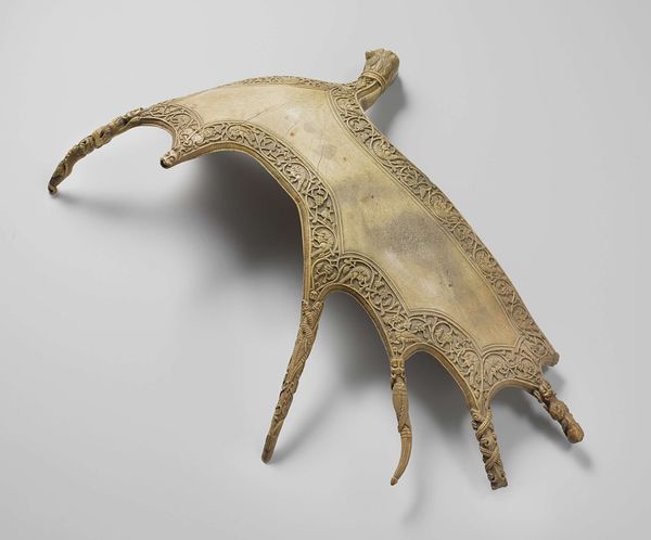 Editor: Here we have a truly unique piece: a filigree pendant in the form of a frog or toad, crafted from gold, dating possibly from 500 to 1000 AD, by the Coclé culture. What strikes me immediately is how delicate yet monumental it feels. It’s like the artist captured a grand spirit in miniature. What do you see in this piece, professor? Curator: Indeed, the interplay of delicacy and solidity is paramount here. Consider the linear quality achieved through the filigree technique. Each gold strand, meticulously placed, contributes to a network of formal relations. Note the strategic deployment of spiraling motifs against the rectilinear framework defining the amphibian’s body. This tension animates the whole, drawing the eye across its surfaces. It appears both abstract and naturalistic, simultaneously. Observe how this strategic pattern, this very controlled chaos, enhances the overall dynamism of the work. Editor: I’m particularly drawn to how light filters through the latticework. Does the negative space have any meaning in relation to the solid gold? Curator: Excellent question. The manipulation of positive and negative space serves to dematerialize the subject. It isn’t merely a frog, but a symbolic construction *of* a frog. It alludes to a primal archetype via the conscious arrangement of lines and voids, thereby challenging our preconceived notions of material presence and absence. Does the base of the pendant present other intriguing features, as well? Editor: Absolutely, I also wonder about the circles dangling at each leg... the repetitive shapes almost appear musical. It seems as though the artist may have taken special care in the adornment and details of this amphibian! Curator: Precisely. Form, in its purest manifestation, often possesses an inherent musicality, a rhythm born from the conscious ordering of elements. Studying its architecture invites a profound reflection on our visual habits. I would offer that it stands to suggest that what truly defines "art" lies not in its overt subject, but within the aesthetic and technical skill involved in representing its composition. Editor: This has helped me understand how even a seemingly simple piece of jewelry can be read as a complex arrangement of formal relationships. Curator: Exactly. Now, equipped with such insight, one appreciates more about artistic intention of even the oldest jewelry artifacts.