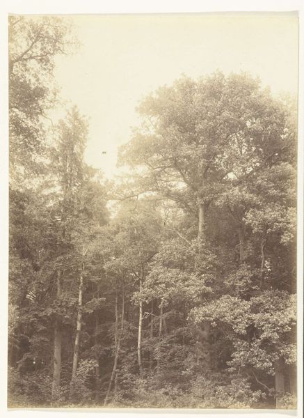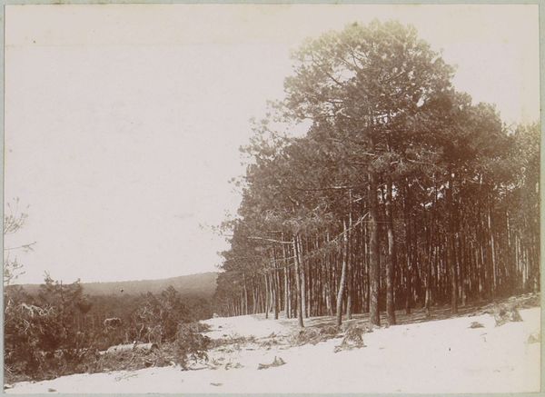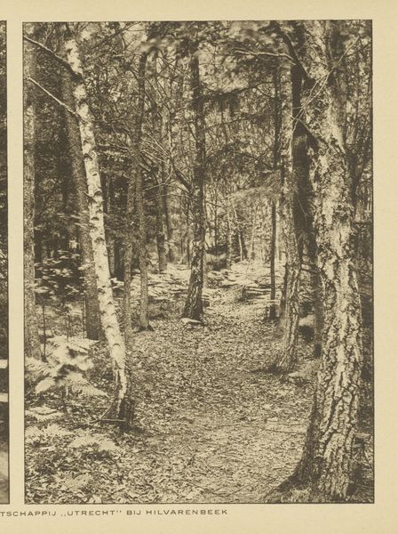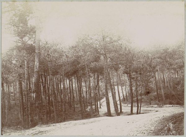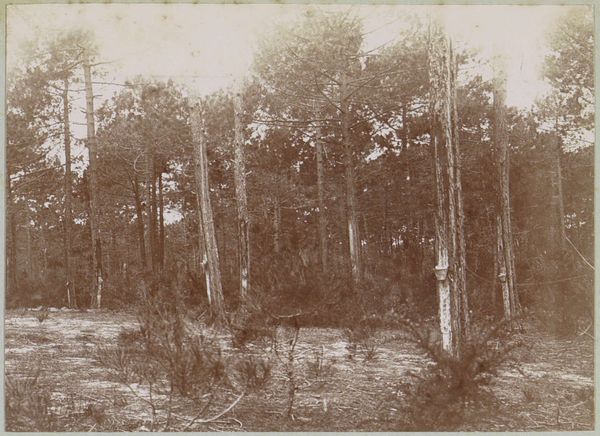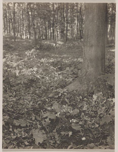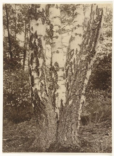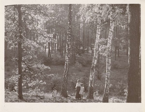 Curator: This is a photograph called "Birches in a Pine Forest" by Richard Tepe, probably taken sometime between 1900 and 1930. Editor: It's a scene shrouded in quietude, almost sepulchral with its monochromatic tonality. The composition feels very...vertical, doesn't it? Curator: Yes, the eye is immediately drawn upwards by the stark white birch trunks against the darker evergreens, and against a shadowy background. Birch trees often represent purity, new beginnings, or growth because of their vibrant color and ability to grow back quickly after being cut. The contrast with the darker, more established pines hints at themes of resilience. Editor: Structurally, that sharp contrast creates a real tension. The birch are positioned very deliberately, creating a strong foreground, dividing the picture into clearly defined planes. This draws me in. Do you know anything about the printing process used? Curator: While the exact technique Tepe used for this piece isn't specified, his work is generally associated with pictorialism. Editor: Pictorialism, of course. It emphasizes the aesthetic beauty, in much the same way painting does, by focusing on softness, texture, and tonality rather than purely sharp, objective depiction. You see that soft focus, that almost hazy quality in the details? It's deliberately evoking a mood. Curator: Absolutely. Consider the context of its creation, during the rise of industrialization. Images of nature were potent symbols that evoked longing for an idealized, more 'authentic' past and life. Editor: And Tepe clearly wants us to feel it. He is creating an intensely composed artwork out of nature rather than merely capturing nature with a camera. It is definitely of its time in that respect. I might add the placement of the single birch at left creates a kind of picture-within-a-picture effect. Curator: Interesting, I hadn't thought about that aspect of the work, and yet it offers the composition, again, so much verticality and tension between planes of shadow and light, purity, and experience... Editor: Ultimately, "Birches in a Pine Forest" offers more than just a tranquil scene; it provides an emotionally nuanced study of resilience, change, and enduring beauty in the natural world. Curator: And a striking visual record of the aesthetic sensibilities of a pivotal period in history.