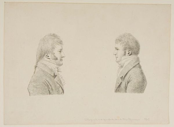 Editor: This is Antoine Philippe d'Orléans's "Portrait of the Artist and his Brother, Louis-Philippe, Duc d'Orléans." It's a drawing on paper. What social dynamics are in play between these two brothers, given the tumultuous historical context? Curator: Well, consider that Antoine Philippe and Louis-Philippe were members of the French aristocracy during a period of immense upheaval. This portrait, rendered with such delicate lines, speaks volumes about the societal pressures and expectations placed upon them. How do you see their identities reflected in their portraits? Editor: They appear very proper, but their stories certainly reflect political turmoil. I hadn't fully considered the impact of historical context on sibling dynamics. Curator: Exactly! And remember, art isn't created in a vacuum. Understanding the era is key to unraveling layers of meaning. Editor: I see that now. Thanks!