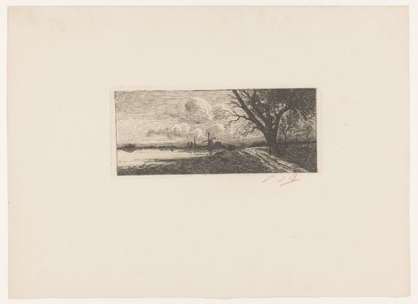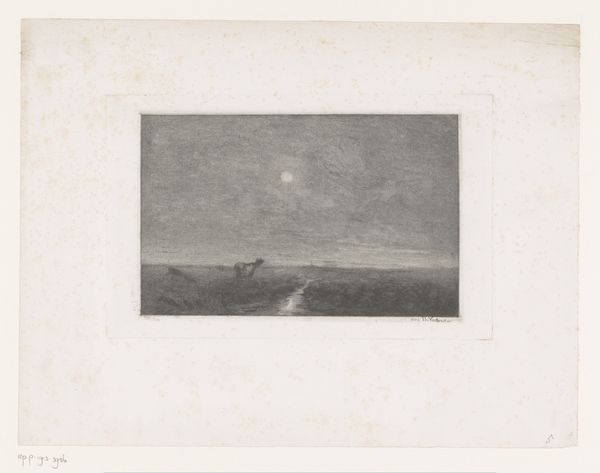 Jules Guiette created this evocative etching, "Moeras met vier wilgen", with delicate lines that capture a tranquil, almost ethereal scene. The composition, dominated by horizontal planes, creates a sense of vastness, while the monochromatic sepia tones evoke a melancholic mood. Guiette masterfully uses the etching technique to play with light and shadow, giving depth to the marsh landscape. The reflection of the moon in the water bisects the composition. It creates a mirroring effect that doubles our perspective. The barren trees and distant birds, rendered with minimal yet precise lines, punctuate the horizon. They suggest both the starkness and subtle beauty of the natural world. The very structure of the artwork destabilizes conventional landscape painting. The tonal range functions as a signifier of subjective feeling as much as objective representation. This piece invites us to contemplate the intersection of nature, perception, and emotion. It encourages us to find beauty in simplicity, and meaning in quiet observation.