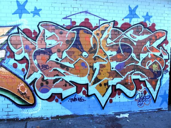 Editor: This is "Bomb", a graffiti piece. Unfortunately, the date is unknown, but the artist used acrylic paint. I am really interested by the layering, as if we’re seeing something emerge right before our eyes. How would you analyze its visual construction? Curator: A most astute observation! Notice the relationship between figure and ground. The yellow form pushes forward, but the concentric layering and gradations around each letter keep our eyes oscillating between foreground and background. Do you see how the dynamism inherent in street art translates to visual instability here? Editor: Absolutely, the curved shapes against the brick also create an interesting contrast of texture, which seems key here. The urban background acts almost as a canvas in itself! Can you say more about the importance of this relationship between support and figure? Curator: Indeed. The materiality of the wall anchors the ephemeral nature of the spray paint, giving a sense of context. Further, consider how the formal qualities of graffiti disrupt the geometry and grid of the wall, injecting vitality and movement into an otherwise static surface. Note the visual play of line and shadow that reinforces depth and three-dimensionality, despite the flatness of the wall itself. Editor: This has certainly given me a new perspective to appreciate not just the style, but also the artistic decision-making behind these artworks. I'll never look at a tagging the same way! Curator: Agreed, seeing graffiti beyond just lettering into the interplay of elements truly highlights the mastery of their creative act.
