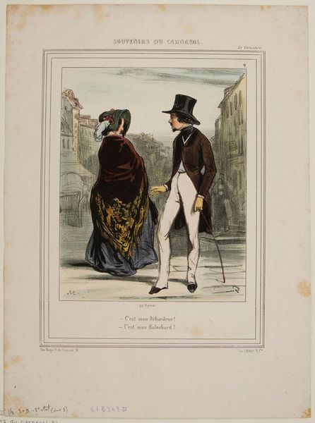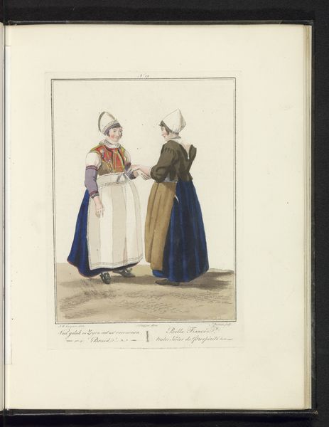 Pieter van der Meulen made this print, "Doopsgezinden uit Kampen", with etching and engraving. It shows a man and woman who are Mennonites, a religious group known for their pacifism and simple living. The image creates meaning through visual codes. The clothing, particularly the woman's bonnet and the man's hat, marks them as belonging to a specific social and religious group in Kampen, Netherlands. The print was made in the early 19th century. It reflects the era’s interest in cataloging and classifying different social types. The image also points to the history of religious tolerance in the Netherlands. Despite facing persecution elsewhere, groups like the Mennonites found relative freedom to practice their faith. Works like these contributed to a sense of national identity rooted in diversity and tolerance, but also remind us of the power dynamics inherent in representing minority groups. To understand this print fully, scholars might research the history of Mennonites in the Netherlands. Also, prints like this are valuable sources for understanding how people saw and understood social difference at the time.