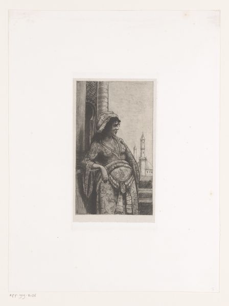 Editor: So, here we have "Gevangene aan geselpaal", or "Prisoner at the Whipping Post," created in 1897 by the Monogrammist JC, using etching on paper. It has quite a somber feel. The composition is simple: a figure illuminated by candlelight, but I'm curious, what jumps out at you? Curator: It's the material story that captivates me. Look at the etching—the acid biting into the metal, a process controlled by the artist’s labor to reproduce this image. Think about the paper too, the methods to produce that very medium. It suggests the social context – prints were more accessible, produced to meet the demands of a wider, consuming audience. Consider what a print like this might have represented to that public, what narratives of crime and punishment they would have absorbed, mediated through the mass production of art. Does it challenge the traditional perception of fine art, by lowering the amount of time it takes to reproduce an image? Editor: That’s a great point. I hadn’t considered how accessible this medium would be and how it allows more viewers access to the work. But what about the image itself; can it hold meaning on its own? Curator: Of course, it does! The realism, the prisoner's posture... However, even that is framed through material means. The artist, Monogrammist JC, used etching techniques available to create this realistic portrayal. Also, this etching exists *because* it's easily copied and reproduced. Editor: So, the technique, materials, and its method of reproduction become a central theme and change our viewing experience. Curator: Precisely. They shaped the artist's decisions and ultimately how the piece communicates its message, how it was consumed. Seeing the value in this simple medium brings forward new questions. What statement did these materials intend to produce for that society and its consumers? Editor: That's given me a lot to think about regarding labor and accessibility and production of the materials. I will have to keep all of that in mind while appreciating and studying other forms of art. Curator: Exactly, and perhaps this piece can shift your whole framework as you analyze different works going forward.