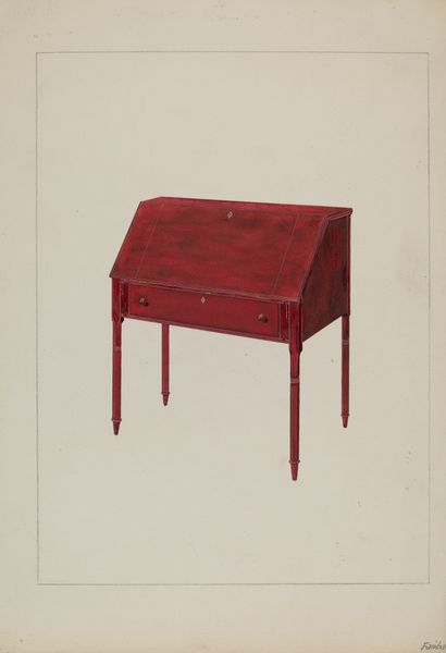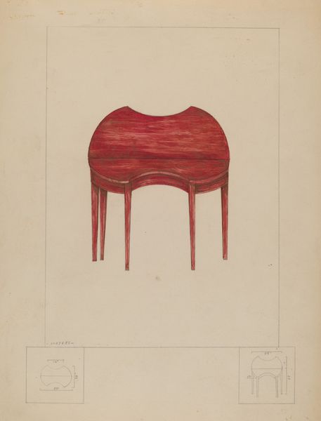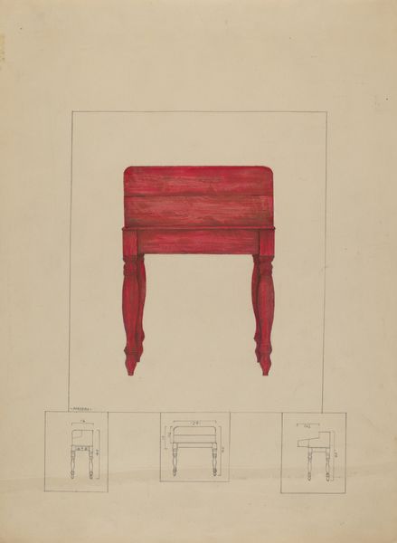 Curator: This is Henry Meyers' "Writing Desk and Table," dating from sometime between 1935 and 1942. It's a watercolor and drawing, giving us an elevation view of the piece, along with smaller diagrams indicating measurements. Editor: That striking red color immediately grabs you. It feels almost…regal. It elevates a simple object, a desk, to something symbolic. A seat of power, maybe? Or intense concentration. Curator: Well, given the period, and Meyer's background as a furniture designer associated with the Federal Art Project, it is more likely he sought to provide affordable quality furnishings to a wider population, rather than evoking any exclusive royal status. These items offered tangible and decorative appeal as functional forms. Editor: Even so, red carries powerful connotations. Red ochre has marked significant sites of ceremony or record since the paleolithic. Do you think he chose it consciously? Curator: The execution suggests practical considerations reigned over elaborate symbolic intent. Look how the medium and details are prioritized over refined artistry. The architectural rendering quality conveys information, pure and simple. We cannot definitively impute some overt intent from the symbolic resonance that color red invariably carries through time. Editor: True, though one sees such pieces replicated over time as antiques that carry echoes from past usage in later cultural settings: This kind of wooden form, enlivened by rich reds, brings me to ancestral parlors, places filled with memory and passed-down wisdoms. Don’t you see that? Curator: Perhaps. However, consider what such furniture actually signifies. Accessible production via new-deal programs democratizing the art market of functional items seems a bit at odds with high bourgeois settings steeped in traditions that typically defined who could even consume high end crafted artwork or collect unique things in previous eras. It also highlights a crucial public purpose the desk embodies when considering social access to material culture generally speaking in that time. Editor: Well, that just adds a new layer to the object's story for those coming across something similar in our present, isn’t it? History and individual narratives intertwined. Curator: Absolutely. Considering that social landscape shapes our understanding in unexpected ways! Editor: Quite insightful, offering new layers as always, which help deepen the symbolic associations that inevitably bubble forth...