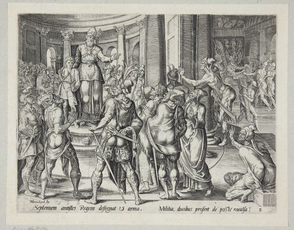 Curator: Right, let's turn our attention to "The Indian Triumph of Bacchus," an engraving dating from 1537 to 1547, after an earlier work. It is currently held in the collection of the Metropolitan Museum. Editor: My goodness, it’s a real spectacle, isn’t it? Overflowing, almost ridiculously so, with figures and animals. Like a parade dreamt up by a wildly imaginative toddler who's been given free rein of the mythological dressing-up box. Curator: Precisely. Enea Vico, the artist behind this engraving, was deeply embedded in the Mannerist style, favoring complex compositions, elongated figures, and a sense of heightened drama. Bacchus's triumph was a popular theme used by Roman Emperors to assert their power. Editor: The longer I look, the more absurd it becomes! Are those… giraffes? Carrying drunk, slightly-too-casual gods? There's such a strange juxtaposition of the exotic, almost humorous animals, with this very serious classical setting in the background. It’s all columns and composure in the back, but total revelry in the foreground. Curator: Exactly. This print, like many Renaissance prints, was as much about spreading ideas as it was about artistic expression. The depiction of exotic animals would certainly appeal to a larger audience, a means of both instruction and engagement, furthering an understanding of Bacchus in relation to conquest and excess. Editor: I find the medium interesting as well, given the precision demanded by engraving. Think of how methodical it must have been to create all of those delicate lines, hatching to create shadow, capturing something so exuberant through meticulous process. The level of control against such bacchanalian abandon! Curator: Indeed, and through dissemination as a print, this image, though conceived initially for an elite audience perhaps, ultimately entered into broader circulation. These works played a crucial role in the evolution of taste. Editor: This piece makes you realize that beneath any triumph, no matter how grand or historically impactful, is always just a really good party... Or at least the possibility of one! Curator: Indeed. Its enduring legacy underscores how artworks shape our understanding of the past while simultaneously offering moments of connection with our humanity.