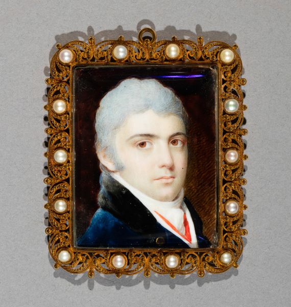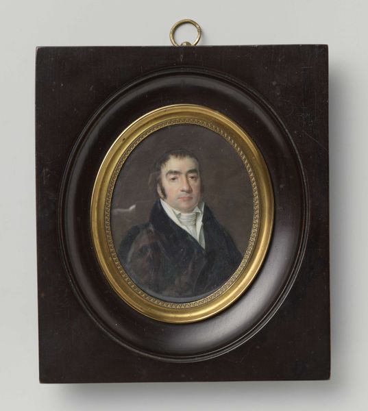 Curator: Before us hangs "Jacob Jurriaan de Friderici," an oil on canvas portrait completed before 1860 by Nicolaas Pieneman. The work is currently held here at the Rijksmuseum. Editor: My initial impression is a study in controlled power. There's a somber intensity to his gaze, which dominates despite the darker hues. It suggests a personality deeply entrenched within societal structures. Curator: Indeed, Pieneman, who worked in the Romantic style, frequently focused on historical depictions and portraits of prominent figures. This work, representative of academic art, captures more than mere physical resemblance. Consider the implicit narratives woven into the piece, with symbolic weight subtly implied. Editor: The man's assuredness is visually constructed; I'd guess it speaks to the specific societal role assigned to men during this historical moment. His attire— the high collar and dark overcoat—seems less a matter of personal taste and more a signifier of societal rank and power. Curator: That black coat absorbs a lot of the light in the painting, yet his face is brightly illuminated. We focus our immediate attention on the sitter’s personality, despite his garb conforming to established expectation. Even his hair seems consciously arranged. Editor: Precisely. We should also think about the cultural framework and societal privileges granted to the sitter as a white man, no doubt a member of the wealthy Dutch upper class, which undeniably shapes the representation itself. Even now, that constructed history informs our perception. Curator: I’d say it's not just a social construction but an intentional assertion of identity through visual language, one layered in implicit narratives and familiar tropes that an audience of that time would quickly understand. Consider that for generations images played the important role of defining social standing. Editor: And images like these still wield influence, albeit perhaps in subliminal ways. Deconstructing them exposes the ways such compositions might re-inscribe old hierarchies of wealth and influence and invite critique and re-evaluation of societal norms. Curator: That opens fascinating questions about the role of museums, which often hold power to both display and interpret the very codes these portraits present. Editor: Well, precisely. By critically analyzing such artworks, perhaps we find ways to dismantle such antiquated frameworks while expanding modern audiences’ appreciation.