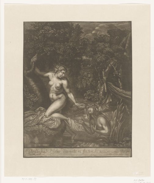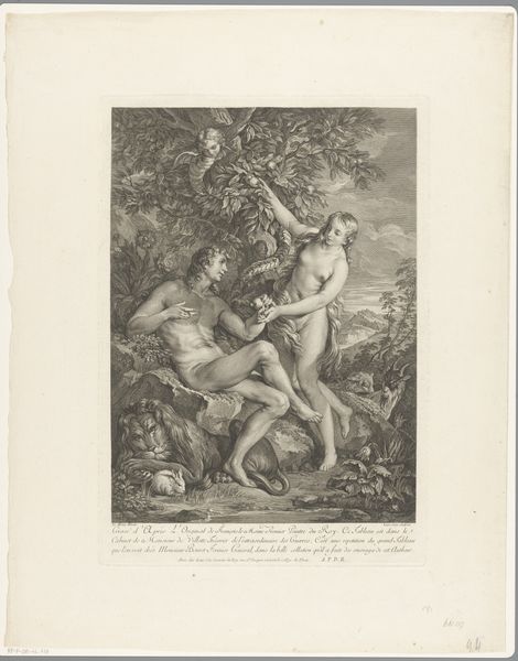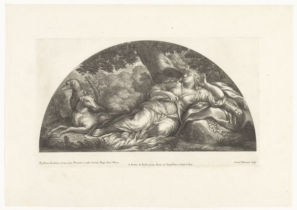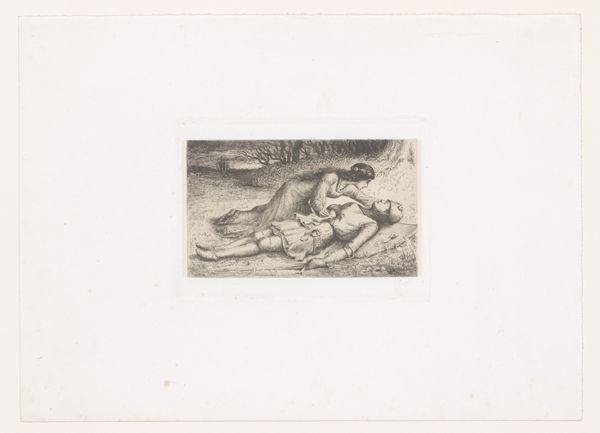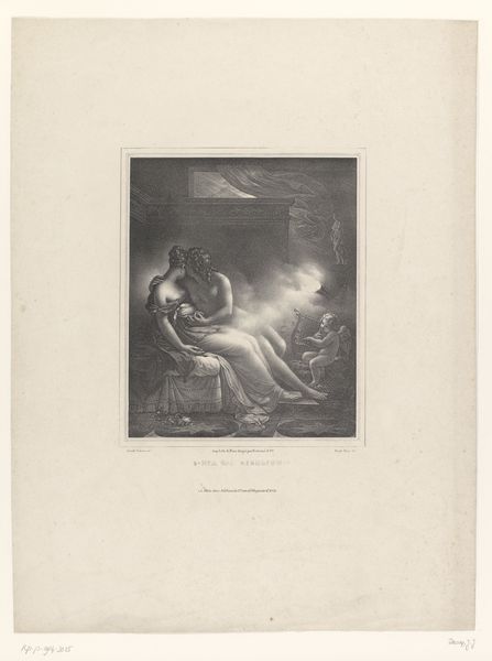 Editor: Here we have Adam Friedrich Oeser's "Amor en Psyche," dating from 1732 to 1799. It's a drawing, a pencil sketch on paper. The mood is dramatic, with a clear contrast between light and shadow. What do you see in this piece from a formalist perspective? Curator: Formally, the drawing presents a compelling study in contrasting textures. The soft, almost blurred rendering of Psyche's sleeping form is set against the more defined lines of Amor. Note also how Oeser uses the fall of light to structure the scene. The illuminated figure acts as a focal point, leading the eye across the composition. The engraving seems almost to be concerned more with a balance in texture than anything. Do you notice the symbolic relation of the objects depicted and the structural weight within the composition? Editor: I see what you mean about the balance and the texture. The sharper lines on Amor and the drapery draw my attention first. How does the artist use this play of light and shadow, and the textures, to convey the narrative? Curator: Oeser uses chiaroscuro not only to model the figures but also to heighten the drama inherent in the scene. The stark contrast pulls Amor out of what would have otherwise been an inconsequential planar backdrop, highlighting Psyche’s vulnerability. Can we thus view light as an element that emphasizes specific facets of the composition and helps reveal the relationship in texture and emotionality here, that between soft skin, the feathered wings, and drapery, all illuminated unevenly? Editor: I see that now; it brings another layer to the drama of the subject. The use of different line weights helps, too. This reading brings an added layer to the myth. Curator: Precisely. And notice how all aspects can lead to enhanced insight into the composition's purpose. Hopefully we learn here of structure in the art and beyond the content presented by myth.