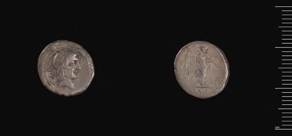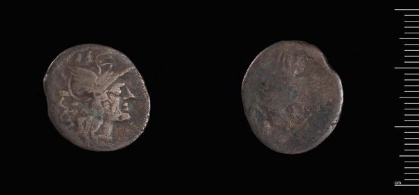Editor: This is a Denarius of M. Aburius Geminus, from Rome. It's just a small coin, but it looks quite powerful with the imagery. What do you see in this piece? Curator: This coin speaks volumes about Roman identity and power. The imagery on Roman coins were carefully chosen to convey messages about the state, its values, and its leaders. Who do you think the figures represent, and what sociopolitical narratives do you think the artist is trying to convey? Editor: It’s interesting to consider that even something as small as a coin could be used to shape public opinion. Curator: Absolutely! It reminds us that art is never neutral, it always reflects and shapes the society it exists within.