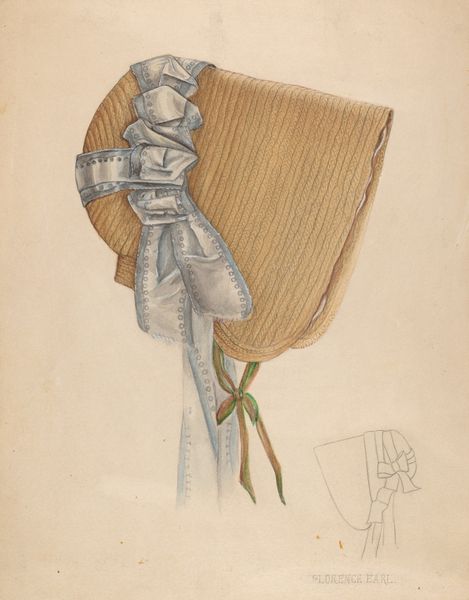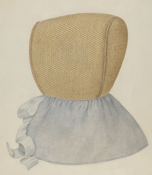 Editor: Here we have Orville A. Carroll’s "Bonnet," a watercolor drawing dating from sometime between 1935 and 1942. The drawing has such an academic feel to it. I wonder, how can we begin to interpret this simple image? Curator: Focus on the geometry. The bonnet is built from juxtaposed geometric volumes. Observe the stark contrast of textures; the smooth fabric of the drape in comparison with the straw texture of the upper portion of the bonnet. The ribbon introduces an almost diagrammatic linearity to the otherwise volumetric piece. Editor: The straw-like texture really stands out! What does that choice in materiality do for the work? Curator: Precisely! It interrupts the continuity of the gray hues and directs your eye up the z-axis to linger upon the artist's handiwork. Observe the gradient of light in the fabric; there's a careful orchestration of shadows. Does this modulation have an effect? Editor: It definitely feels very calculated, with that strategic interplay of light and shadow bringing out such fine, refined volume! It certainly adds to the overall air of quiet contemplation. Are we meant to consider more than just the visible reality of the object? Curator: Note the artist's ability to find the latent geometry within what appears to be an organic configuration of fabric. He directs your focus through deliberate acts of construction and erasure using watercolor. Editor: Looking at this artwork now, it's evident the intention was never just about depicting a bonnet. Curator: We’ve moved beyond simple representation into an engagement with form, volume, and texture! It's a semiotic investigation contained within a seemingly simple image.
