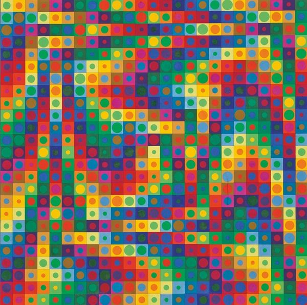 Curator: Welcome. Here we have Victor Vasarely's "Firaxo" from 1977, crafted using acrylic paint. It's a powerful example of his Op Art style. Editor: It's... disorienting! The patterns fight each other, making it hard to focus. It feels almost confrontational. Curator: Interesting. From a materialist perspective, Vasarely’s consistent use of acrylics allowed him to explore a smooth, even application of colour, crucial for achieving the illusion of depth and movement, don't you think? The surface lacks any obvious texture from brushstrokes. Editor: Absolutely. I can't help but think about the socio-political climate of the late '70s when this was made. The oil crisis, widespread social unrest – "Firaxo," with its unsettling visuals, seems to reflect the instability of the time. It embodies post-modern skepticism towards utopian visions. Curator: You’re highlighting its potential commentary. Op Art, however, moved away from direct political commentary, choosing instead to explore perception and how our eyes interpret visual information through simplified processes and geometry. Editor: But that removal IS the statement, right? Escapism, perhaps? Mass production and consumption, all those neat little checkerboard boxes remind me a bit of suburban conformity gone awry. Are those allusions just my projection? Curator: The painting technique itself embodies industrialized approaches by minimizing traces of the artist’s hand to produce sleek lines and colors for a consumerist audience eager for something 'new' from their factories during a moment of growing economic change worldwide. Editor: It’s almost architectural, too—a distorted urban landscape perhaps, one designed to both attract and alienate? How do the illusions of space engage or even confront viewers? Does the repetitive motif indicate labor, perhaps, an infinite factory churning out identical modules? Curator: One might interpret that within "Firaxo’s" aesthetic—Vasarely wasn't simply generating optical trickery. He engaged deeply with industrial methods and his artworks served in ways for democratizing the concept for fine art so the piece becomes not just decorative but something reproducible for design. Editor: Precisely. This makes it something everyone can own regardless their socioeconomic background by bringing abstract concepts straight into homes with consumer goods; challenging how art and decor influence class consciousness and material aspiration through accessible consumption. Curator: Yes, this changes my thinking and reveals new meanings, indeed. Editor: Same here. It is difficult to perceive something objective—so many different cultural associations change the material object completely!