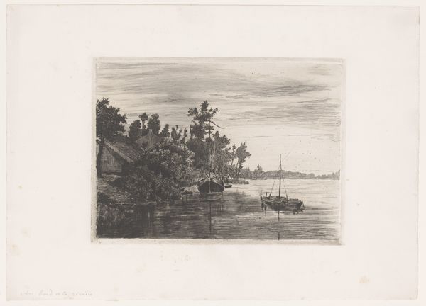 Curator: Jules Guiette created this etching titled "Gezicht op een dorp aan een rivier in de avond," or "View of a village on a river in the evening," sometime between 1862 and 1901. Editor: It has such a still, quiet quality. Almost mournful, with those muted tones and soft light reflecting on the water. The level of detail is remarkable given the nature of etching, it’s nearly photorealistic. Curator: And that quality speaks directly to the burgeoning market for such landscapes among the rising bourgeois class. Etchings such as this were affordable, reproducible, and perfectly sized for domestic display, fueling a broader consumption of art. How were these images circulating and being consumed within domestic settings? These questions really strike me. Editor: I agree. There's also the implied labor—consider the artist's process, the physical act of etching, the acid, the press. It gives me an appreciation for the tangible craft that goes into printmaking, resisting the high/low art distinction of the time. Curator: Yes, and I see the work responding to specific exhibition and collecting trends, fitting a gap in the late 19th-century art market. Editor: Looking closely at the small illuminated windows depicted in the artwork, one almost imagines the inhabitants are aware they may be under observation. The lights seem less functional, more aesthetic or theatrical than they might appear. Curator: And note the depiction of the industrial in the context of the agrarian: these towns are hardly disconnected from manufacturing or commerce. This challenges the idea of landscape purely as an untouched, pristine place. Editor: Exactly. Perhaps an intentional commentary, perhaps mere reflection of an era… But even at that scale, Guiette manages to capture a specific moment in time. The sky and water communicate an idea that goes far beyond a mere depiction of objects. Curator: I’m so glad you noted that element. These etchings speak to broader shifts in what kind of art was being produced, for whom, and with what level of technical and intellectual engagement from both maker and consumer. Editor: Agreed! There’s far more here than just pretty scenery to consume.