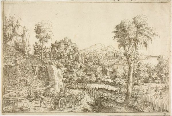 Editor: So, here we have Hanns Lautensack's "River Town with Two Watermills." It looks like an etching, tiny but teeming with life. I'm struck by how the town seems both protected and dwarfed by that massive rock formation crowned with a castle. What do you see in this piece? Curator: Ah, Lautensack! He has such a wonderful vision! For me, it’s the dance between the real and the imagined. Look at the detail lavished on the town, and how it contrasts with the almost dreamlike rendering of the landscape. The castle perched above, a silent guardian, almost like a thought, don’t you think? Editor: I see what you mean. It feels like he's not just documenting a town but also capturing a feeling, like a memory. Curator: Exactly! Maybe even his own longing for an ideal, safe haven, nestled between the everyday and the eternal. What a beautiful sentiment! Editor: This makes me want to visit this place, even if it only exists in Lautensack's mind. Curator: Precisely, the art is a portal.