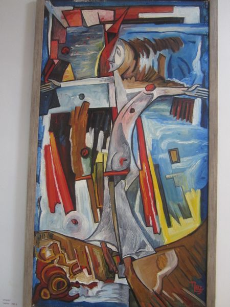 This painting was made by Gogi Khutsishvili, who passed away in 1993. It seems to have been executed with oil paints on canvas or board. Khutsishvili seems to have built up the image with bold strokes and vibrant colors, creating a dynamic composition of geometric forms. The handling of the paint is expressive, almost impulsive; we can see its texture on the surface. The materials here – oil paint, canvas or board – belong to a long tradition of easel painting. But it’s the way these materials are handled that makes this painting interesting, particularly because Khutsishvili did not blend the pigments on the canvas, but rather juxtaposed them to create form and depth. This allowed him to emphasize the material qualities of paint itself, its viscosity and color. Ultimately, the artwork reminds us that materials are never neutral; they carry histories of art-making practices and techniques, and of wider social and cultural values. It's through understanding the material choices and processes that we can fully appreciate the artist's vision.