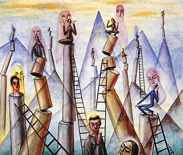 Xul Solar made this, Barreras Melódicas, with watercolor, exploring a landscape of pointy mountains and linear paths. It feels like a system, maybe even a game or a musical score. The hand of the artist is present, but the geometric abstraction leads to a depersonalized vision of a world. The texture is smooth but gives the illusion of dimension. There are small figures ascending ladders, so we get a sense of scale. Look how he creates a kind of otherworldly atmosphere, with a palette of muted browns, purples, and yellows. The shading on the mountains is soft, giving them a rounded, almost fleshy quality. I love the way the ladders create lines and angles against the curves of the mountains. It's as if the artist is mapping out a journey, both physical and spiritual. Solar reminds me a bit of Hilma af Klint, another artist who was interested in spiritualism and abstraction. I think art is about creating spaces for multiple interpretations, and this piece really embodies that idea.