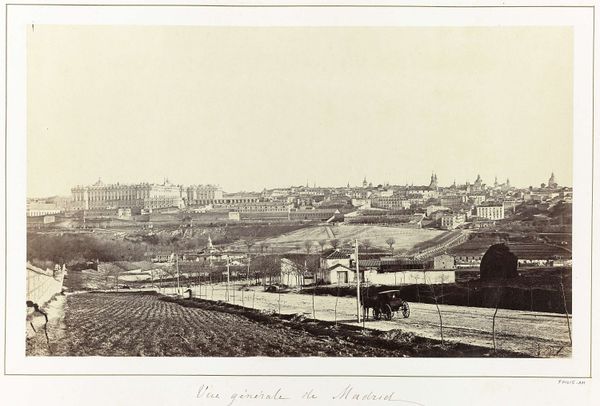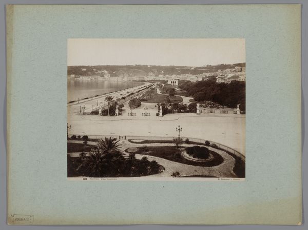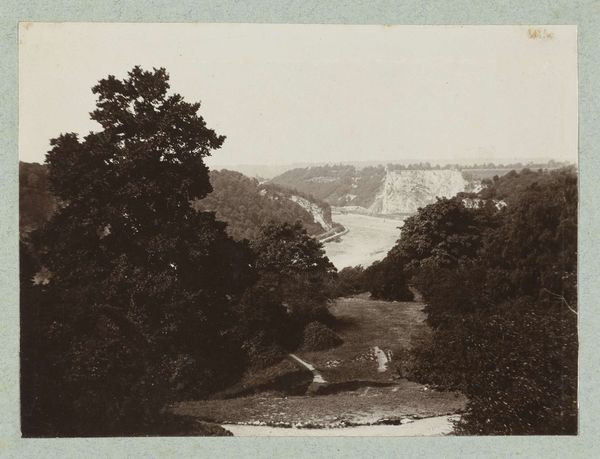 Curator: Frances Sutherland Mann, likely working between 1870 and 1900, captured this scene, “Gezicht op Hastings met de ruïnes van Hastings Castle, gezien vanaf het station”—that is, “View of Hastings with the Ruins of Hastings Castle, Seen from the Station.” The medium here is a gelatin-silver print. Editor: My first thought is the light. It's a subdued, hazy kind of light that almost romanticizes the ruins in the background. You can almost smell the dampness. It certainly sets the atmosphere. Curator: Indeed. The choice of gelatin-silver print aligns well with that sensibility, granting the image both soft tonality and a certain crispness. Think about the late 19th century and photography, how a new set of eyes using technology mediated lived experience. There is an element of pictorialism evident in that treatment. Editor: Right, this wasn’t a quick snapshot from a smartphone! I’m drawn to that foreground fence and the path leading to it. It feels very deliberately placed, directing the eye, and framing what becomes a somewhat regimented landscape of tightly packed houses. Curator: Precisely, and this is where we move from light into form. That gate speaks to a moment of transition from pastoral space to urban growth. Do you see the implied narrative—a path from nature to progress and back to history marked by that ancient ruin? The cultural memory of the castle set against the then-contemporary housing developments… Editor: So much feels hidden though, softened—look at the texture of those houses and the contrast between the vegetation in the front and them in the back. Considering the materiality, gelatin-silver allows for a degree of control over contrast. It isn’t only *what* she photographed, but *how* she developed this scene, drawing out the details she wanted us to focus on, and letting the background fade in soft tones.. Curator: Absolutely. Hastings was then transforming from a small medieval town to a popular seaside resort. A silver gelatin print was easily reproducible at the time. The cultural association and easy handling suggests this would have made its way into middle class parlors and gift exchanges rather rapidly. Editor: I find this scene compellingly layered: landscape and cityscape melded with history and industrialization. All created through alchemic-like darkroom processes! I can really appreciate how this one small object would hold and mediate large transitions. Curator: So, what at first appears a simple landscape photograph becomes, upon closer examination, a window into societal shifts and personal perspectives.