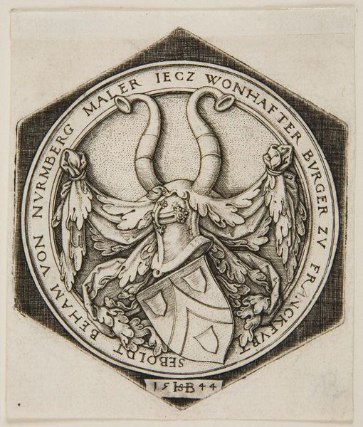 Sebald Beham created this coat-of-arms print on paper sometime in the first half of the 16th century. Beham was a German printmaker and painter, operating during the tumultuous years of the Reformation. This piece presents a classic symbol of power and lineage. The lion rampant on the shield, the helmet, and the crest of wings all speak to established heraldic traditions. But look closer: the inscription in German encircling the image suggests this is not merely a symbol of nobility, but a personal motto. The words imply a divine grace bestowed upon the Weiss family, suggesting that their status is divinely ordained. As the Reformation swept through Europe, ideas about authority and social hierarchy were hotly contested. Beham himself was exiled for his radical beliefs. In this context, the print invites us to reflect on how families like the Weiss's sought to legitimize their power during a time of immense social and religious change. What does it mean to claim divine favor in an era of upheaval? How might the emotional resonance of family identity and pride be amplified when the old order is crumbling?