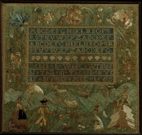 Editor: We are looking at an embroidered sampler made in 1784 by Mary Austin. It's at the Met in New York. There is something very quaint about it, and almost a little sad, like a relic of childhood and a very different era. How do you interpret this work? Curator: This sampler speaks volumes about gender roles and education in the 18th century. It's far more than a simple craft project. The alphabet and numerals represent the core of a young woman's literacy training, essential for managing a household, but also indicative of limited opportunities beyond that domestic sphere. What does the depiction of nature suggest to you in relation to Mary’s world? Editor: I see a pastoral scene: plants, animals, a child-like rendering of a woman maybe? It’s a romantic vision, certainly. Perhaps even an idealization of womanhood in nature? Curator: Precisely. But I encourage you to consider the restrictions imposed by these ideals. The sampler subtly reinforces the notion of women as nurturing figures connected to the natural world but separate from the public sphere. The act of embroidery itself was a carefully prescribed activity that reinforced notions of female patience and docility. And what about Salem – any other contexts that come to mind beyond a placid scene of embroidery practice? Editor: Salem. Wasn’t that where the witch trials took place a century before? Curator: Exactly! Salem reminds us to consider hidden or forgotten narratives. Do you see parallels between the embroidery as carefully "contained," decorative expression and a carefully "contained" and regulated womanhood? This needlework isn't just decorative; it is a document, a quiet protest, perhaps, within the lines. Editor: That makes me think about the power of textiles as a medium for self-expression in a world where women's voices were often suppressed. I learned a lot about reading hidden meanings in this type of art. Curator: It's about interrogating these seemingly simple objects to understand the complex cultural and political forces at play. Never underestimate what can be revealed from seemingly straightforward works!