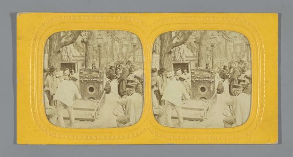 Editor: Here we have an interesting albumen silver print, dating from between 1855 and 1872, titled "Tafereel in een salon, op de achtergrond uitzicht op bergen". It depicts what appears to be a group of people in a salon, with a painted mountain backdrop. The photograph's sepia tone lends it a slightly surreal air. What strikes you most about the construction of this scene? Curator: As a materialist, my focus shifts to the photographic process itself. Think about the labor involved in creating this image: preparing the glass plates, the precise timing of exposure, and the chemical development, all crucial to materialize this moment. Editor: That's a good point. I hadn’t considered the intense, almost artisanal process involved in creating an image back then. Curator: And what does this specific printing process communicate? Gelatin-silver prints offered greater sharpness and detail compared to earlier processes. The very materiality signals evolving techniques influencing how realism was perceived and consumed. It bridges industrial advance with aesthetics, raising questions about the economics of image production at this time. Was photography accessible or aimed at elite consumers? Editor: So, understanding the medium helps us contextualize its role in society at that moment. Do you think that the staged setting detracts from the photo's "realism," since it's clearly not a candid shot? Curator: It reframes what 'real' even meant. Photography aimed to capture truth but the settings, clothing, backdrop and poses point to crafted artifice, a social display as labor. How does this contrast with ideas around portraiture or even "genre painting"? Editor: That’s really helpful. Now I see that the setting itself, in contrast to what looks like hand painted background, it's not just decorative. It's part of how they were marketing this new technology and even constructing their identities. Thanks! Curator: Precisely. By examining the materials, processes and social contexts, we uncover deeper meaning and a more nuanced understanding of art history.