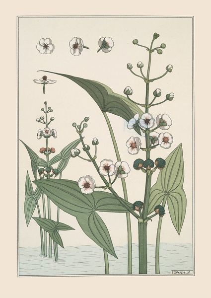 Elisabeth Johanna Koning made this botanical drawing of an Echeveria Grandiflora in an unknown year using watercolour on paper. The composition presents a vertically oriented plant set against a pale backdrop, creating an immediate sense of height and growth. The plant's stem, rendered in subtle shades of green and lavender, leads the eye upward to clusters of delicate, star-shaped flowers. Here, Koning employs a detailed, almost scientific approach, capturing the intricate structures of the plant with precision. Semiotically, the upward direction suggests aspiration and life force, while the flowers, symbols of beauty and fragility, contrast with the sturdier leaves below. Note how the artist balances botanical accuracy with aesthetic appeal, creating not just a record of the plant but also an object of contemplation. The level of detail invites us to consider the hidden structures within natural forms, revealing an underlying order and complexity.