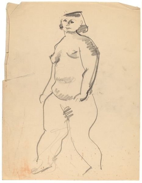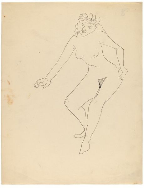 Curator: Here we have a drawing by Mark Rothko entitled "Standing Female Nude, Eyes Cast Down to Left." It's rendered in a delicate graphite line on paper. What are your initial impressions? Editor: It feels vulnerable, almost melancholic. The averted gaze combined with the tentative, searching lines really convey a sense of internal struggle or uncertainty. It’s a very human depiction, raw and unidealized. Curator: The line itself is quite expressive, isn't it? Notice how Rothko varies the pressure, creating a sense of volume and contour with such economy. The swift, assured strokes, particularly defining the limbs, articulate both strength and a certain fragility. Editor: It definitely resists the male gaze. Rothko’s focus isn’t on sexualizing the body, but on capturing its weight, its presence, in a way that feels deeply empathetic. The figure's imperfections—the fullness of her form, the slight awkwardness of the pose—contribute to this sense of authenticity. It reminds us that even Rothko, best known for his abstract expressionism, grappled with the figure, grounding him within art historical dialogues. Curator: Exactly. And consider the composition – the figure dominates the sheet, creating a palpable tension between the drawn lines and the surrounding void. There's very little modeling. The form emerges from a network of linear gestures alone. What does that emphasize? For me it emphasizes her corporeal existence, a physical form occupying the pictorial space in an unapologetic way. Editor: Right. Her placement takes ownership of space, and while Rothko presents a nude, his style almost reclaims it from a potential objectification of women by allowing for a character study – of a person’s emotions, a subject aware of her position as a person, rather than an object. The small bit of dark hatching on the cloth further directs the focus, like a pinpoint of shadow against otherwise mostly continuous line art. Curator: A captivating drawing. Through Rothko’s controlled but also seemingly haphazard rendering of lines, the female figure is given not only form, but presence. It showcases an engagement with structure that underlies much of his later, more abstract works. Editor: It offers a unique perspective on the human form, one that embraces imperfections and seeks to capture the emotional landscape within. I like seeing how artists engage with the history of art, like figure studies, while exploring possibilities to evolve it towards representing lived experiences.