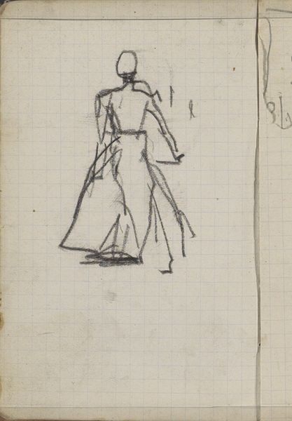 Curator: Breitner's sketch, titled "Waspit op de Lauriergracht te Amsterdam," dating from around 1895, offers a fleeting glimpse into Amsterdam life. It's currently held in the Rijksmuseum. Editor: It feels spontaneous, like a quickly jotted observation. I'm drawn to the simple lines; they convey a sense of immediacy and raw emotion. The texture of the pencil on paper really highlights its production. Curator: Absolutely. Breitner was known for capturing the everyday reality of Amsterdam, moving away from the romanticized views popular at the time. This sketch, with its focus on a solitary figure, offers a social commentary on the urban experience, especially how women navigated public space. Editor: Yes, and consider the labor embedded here. Sketchbooks themselves became affordable and readily available by the late 19th century. Breitner is engaging in a very new type of artistic practice centered on documenting his lived experience. We might compare it to the rise of documentary photography at the time. Curator: Precisely. It also begs the question of Breitner's motivations for depicting Waspit. Was he merely capturing a scene, or was there a deeper engagement with the social and political dynamics of the era? Breitner had an evolving but often ambivalent relationship to women, and he likely thought a great deal about their roles within his art as it developed in the public eye. Editor: You can almost feel the speed with which he worked to catch the light falling across the dress and the buildings in the background, however minimally defined they may be. Curator: A glimpse of everyday labor manifested as art... It does make you appreciate the fleeting moments that art can immortalize. Editor: Exactly, a great example of an artist capturing their impressions of labor in real time. Thanks for shedding light on that!