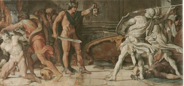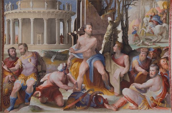 Editor: So, here we have Reinhold Timm's "A Sculptor's Studio," made with oil paint sometime between 1618 and 1639. It definitely strikes me as crowded and busy, all these figures crammed into one space. How do you interpret this work? Curator: The crowding is crucial. It depicts a moment ripe with intersecting ideologies. Notice the dynamic between the artist, laboring physically, and the presence of the idealized sculpture of Mercury. How does this contrast highlight the status, or lack thereof, of the artisan in that period, compared to the celebrated classical figures? What does it say about labor, skill, and creative expression being viewed as high art versus a more commonplace profession? Editor: It feels like it's almost questioning who deserves the most honor in the creative process. Curator: Precisely! This work also speaks to the hierarchies within the studio itself. Observe who is given space, and who is relegated to the background. Does this tell us anything about gender, class, or perhaps even race within artistic workshops of the time? What might the seemingly detached, almost melancholic figures represent within this framework of labor? Editor: That's true. I hadn't considered who was actually centered. So it is almost acting like a historical document with some contemporary reflection from the artist? Curator: Exactly. And how does that tension, that inherent questioning, resonate with our own time when considering who has the power to create, to be seen, and whose stories are elevated above others? It brings visibility to the unsung heroes within these narratives and invites critical discourse on equity, identity, and creative ownership. Editor: Wow, I'm definitely looking at this painting in a completely new light now, realizing it has multiple historical narratives. Thank you! Curator: My pleasure! It's a journey of collaborative uncovering of embedded histories and perspectives that keeps art history vibrant.