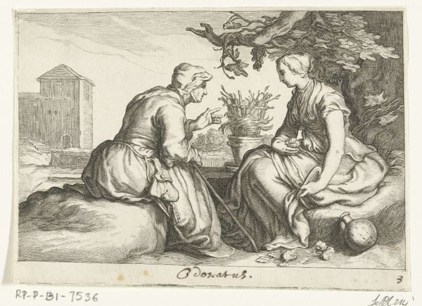 Editor: This is Francesco Bartolozzi's "Holy Family with an Angel," a beautiful drawing at the Harvard Art Museums. The angel seems to be offering the Christ child something, but what is it? What do you see in this piece? Curator: Notice how the fruits held by Joseph mirror the fruitfulness promised through Christ. The angel's presence, a winged messenger, further emphasizes the divine promise. Consider, also, how the gazes converge on the child, visually linking earthly and divine realms. What enduring symbols do you recognize? Editor: I hadn't considered the fruit and the gazes as connected meanings. It's amazing how much symbolism can be embedded within an image. Curator: Indeed. Visual symbols can offer powerful connections to cultural memory.