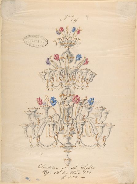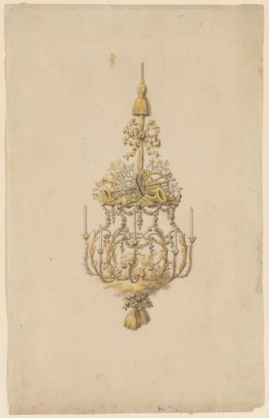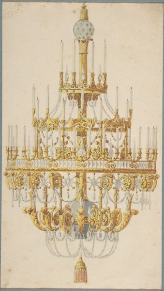 Curator: This drawing, circa 1830, is titled “Ontwerp voor kandelaber,” which translates to “Design for a Chandelier,” attributed to Firma Feuchère. The piece employs watercolor and ink to render a design that is teeming with potential. Editor: It strikes me as quite extravagant. All those shimmering details and cascading crystal droplets - it certainly whispers of opulent evenings and social gatherings, doesn’t it? There's a almost theatrical flair. Curator: Exactly. Thinking about Feuchère, a Parisian firm known for their expertise in bronze and ormolu work during the Restoration and July Monarchy periods in France. Their craftsmanship and clientele reflected a very specific societal milieu. Consider the means necessary to commission, produce, and ultimately maintain such a lavish object. The work itself speaks volumes about labor. Editor: Absolutely. I see that now – beyond the aesthetic, the chandelier embodies power, privilege, and social hierarchy. I mean, the piece almost seems to dare one to imagine who exactly held these extravagant soirees beneath its light. Was it complicit with systems of power that actively harmed and subjugated people based on class, race, and gender? Curator: That's precisely the point. And thinking about production – consider the miners extracting the metal ores, the artisans meticulously crafting each component, from the cast elements to the blown glass… This was not the work of a single individual, but the culmination of a vast network of labor, with its own distinct social order. Editor: It's intriguing how design itself could both reflect and reinforce societal norms. Looking at this chandelier now, I see a complex intersection of beauty, power, and exploitation. It transforms from simply an aesthetic piece to a symbol. Curator: Indeed. So much more than just a light source, isn’t it? This design acts as a window into the social and material conditions of its time. Editor: I'll never look at a chandelier the same way again. What a way to illuminate art!