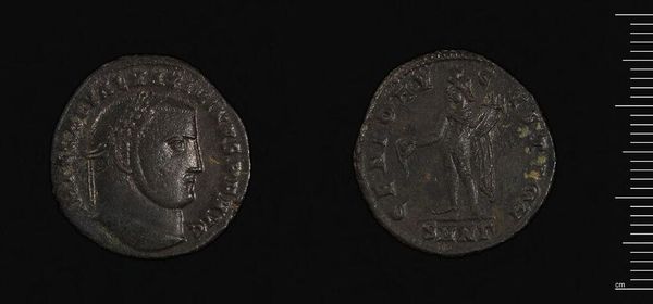 Curator: Here we have a coin of Constantine I, currently held at the Harvard Art Museums. Editor: It looks timeworn, almost like a relic from a forgotten world. Is that a portrait I see? Curator: Indeed. The coin bears the image of Constantine, a powerful figure who legalized Christianity in the Roman Empire. His likeness aimed to convey authority. Editor: And what about the image on the reverse? It looks like some kind of structure. Curator: That's right. It's a depiction of a military camp gate. This symbol suggests Constantine’s role as a protector of his people and the expansion of Roman power. Editor: Amazing how much information and power was invested in such a tiny object. Curator: Precisely. It speaks volumes about the cultural and political ambitions of the time. Editor: These types of objects truly open a portal into the past.