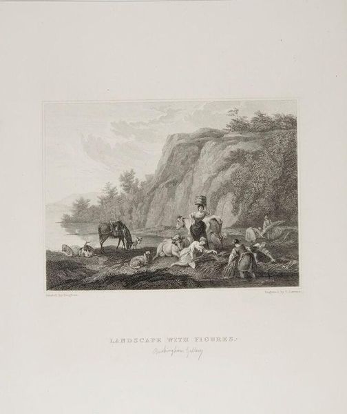 Editor: Samuel Howitt's "Grouse-shooting," created around 1790, captures a hunting scene with incredible detail through engraving. The contrast between the dark foreground and light background is striking. What compositional elements stand out to you? Curator: Observe how Howitt has structured the landscape. The diagonal line formed by the hunter's aim bisects the pictorial space, creating dynamic tension. Notice how the artist guides the viewer's eye using carefully placed patterns and gradations of light. What visual relationships do you see between the hunter and the grouse? Editor: The hunter and grouse seem opposed, almost like mirror images, heightening the contrast. I also noticed that the puff of smoke leads directly to the birds as well, making the connection hard to ignore. Thank you! Curator: Precisely. Formal analysis allows us to appreciate the complex relationships within the image and the artist's sophisticated control of line and tone.