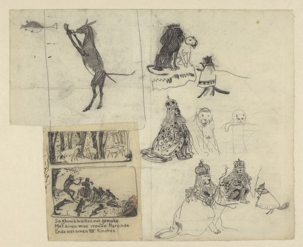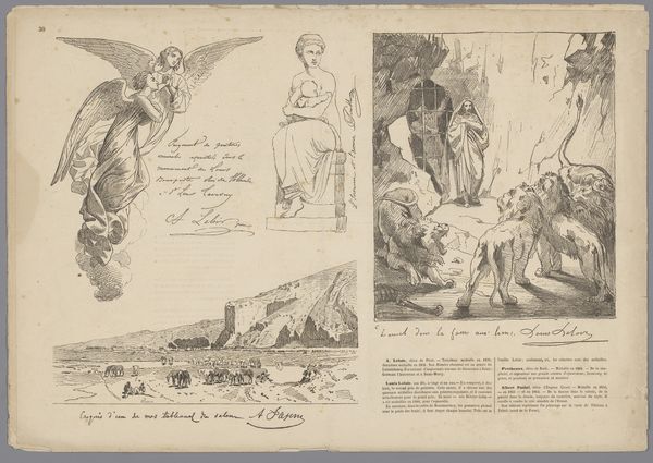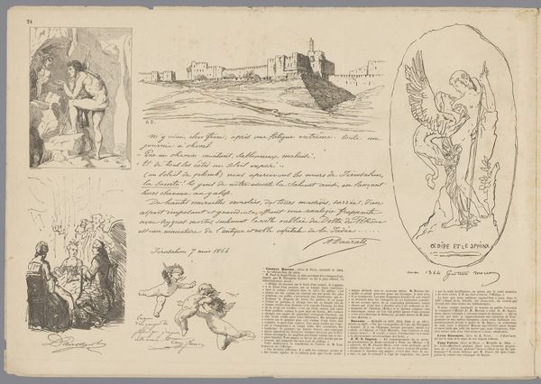 This is a composite drawing by Firmin Gillot, dating from the mid-19th century, and executed in pen and ink. The graphic quality of the lines, ranging from delicate to bold, is what gives the work its visual power. Note the textures he creates simply through hatching and cross-hatching, particularly in the lower register of the composition. In the upper left section, Gillot has meticulously recorded classical motifs – cameos and medals, rendered with archaeological precision. In stark contrast, other parts of the drawing depict scenes of everyday life: washerwomen at work, and a travelling company on horseback. This juxtaposition tells us something about the artist's sensibility, rooted both in the careful study of historical artifacts, and in the gritty realities of labour and transit. The sheet becomes a kind of inventory, or a mood board, of the artist's world. The drawing reminds us that even the simplest materials, expertly handled, can yield complex and compelling images, breaking down the usual distinctions between high and low culture.