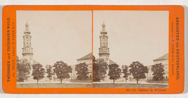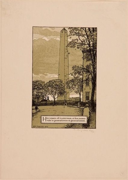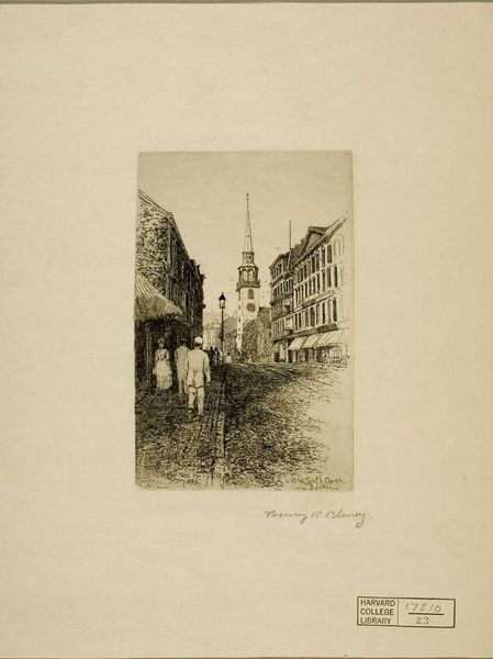 Curator: This is Sidney L. Smith's rendering of Park Street Church. The print showcases incredible detail for its size. Editor: It certainly projects a feeling of austere grandeur, doesn't it? The spire really dominates the composition. Curator: Indeed. The artist uses line and shading to draw the eye upward, emphasizing the church's verticality. The starkness of the trees contributes to that solemn feeling. Editor: Trees, often representing life, appear barren, contrasting with the church. The steeple, a symbol of aspiration, rises above, promising something more than earthly existence. Curator: It is fascinating how the plate itself, roughly 8 by 5 inches, contains such a wealth of formal devices. Editor: Yes, the image feels far larger than its physical dimensions, imbuing the church with a significance that transcends its physical presence. It almost evokes a sense of longing. Curator: Well, this has given me a new appreciation for Smith's technique. Editor: And for the enduring power of symbols to stir our souls, even now.