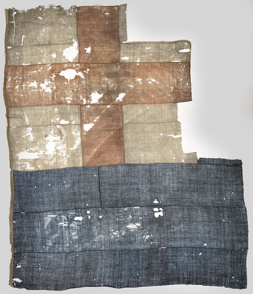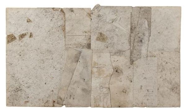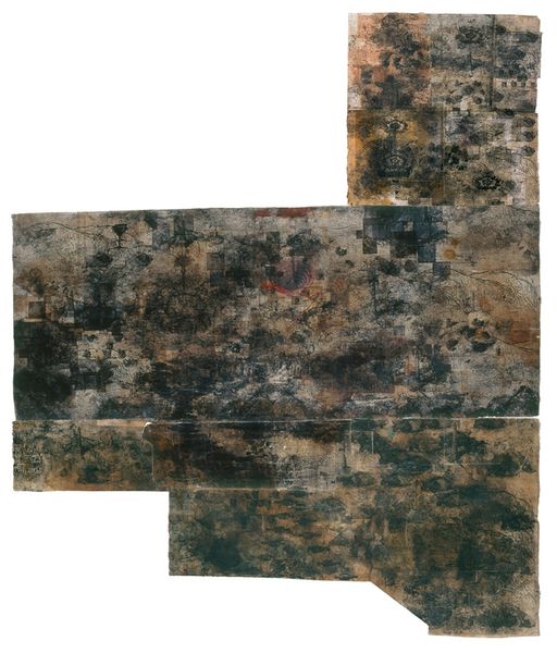 Curator: What a striking presentation. This work by Cornelia Parker, created in 1997, is entitled "From ‘Rough Sea’ Circa 1840 5, JMW Turner.” It resides here at Tate Britain and showcases the artist's distinctive use of mixed media and assemblage. Editor: Initially, I’m struck by the sheer fragmentation. These segmented pieces arranged on a white background; the textures feel timeworn and distressed. Curator: Precisely. Parker is known for her conceptual art practice, and in this piece, she's taken fragments of a Turner painting torn from a book— likely about the iconic painting titled “Rough Sea” — and reconfigured them, thus examining themes of appropriation and deconstruction. It challenges notions of artistic originality and authorship, don't you think? Editor: Undoubtedly. The artist is offering a formal exercise on value—both material and cultural—with each careful repositioning of these swatches that alter the viewer's engagement. There is an exploration into visual relationships, the interplay between figure and ground... It is a stark visual articulation of that concept. Curator: Yes, she disrupts the original narrative of Turner’s seascape, drawing from cultural studies to dismantle art historical authority and reframe Turner's image. It's an inherently feminist gesture, as it questions and reframes traditionally male-dominated art narratives. Editor: Though a social or feminist reading informs this work greatly, let us not diminish Parker's use of structure and materiality. What happens to the image's structural integrity when rearranged—when each scrap can be placed anywhere—that choice is key. Curator: I agree. Thinking of these reconfigured fragments against the backdrop of Parker's wider practice... the destruction of the original book and then her deliberate re-assembly raises questions of what happens to our histories. It becomes a commentary on how we both inherit and recreate cultural meanings. Editor: So, from dissected parts of what might signify "English painting at its most elemental," she builds up something new. From semiotic slippage, one image morphs into the next. I see artifice being laid bare as a deconstruction becomes a new architecture. Curator: Exactly. A compelling engagement for those who value both the visual and the historical elements in a piece of art. Editor: Indeed. It requires we see with both our mind and eye.