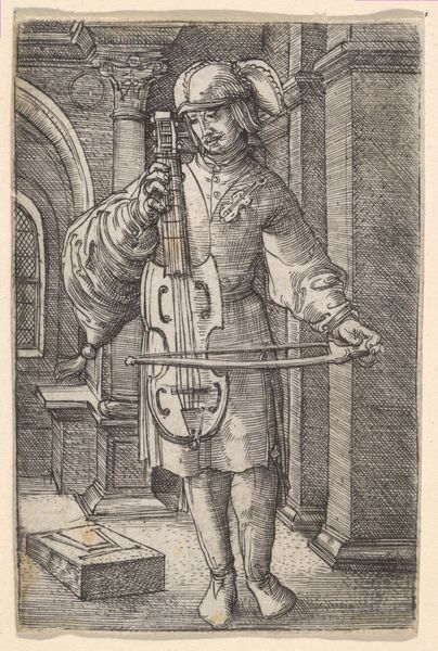 Albrecht Altdorfer created this delicate etching, "Vedelspeler," sometime in the early 16th century. The man depicted is a musician, and the print offers a glimpse into the cultural life of the Renaissance. Consider the role of music during this period: music was often a communal activity, binding people together through shared experiences. Here, the musician's identity is central. He's not merely a performer; he embodies the cultural values and artistic practices of his time. The weight of the instrument and the performer's solemn expression suggest the importance of music as a craft, a profession, and a cultural force. Altdorfer's decision to depict this musician speaks to the rising status of artists and performers in the Renaissance. As you reflect on this image, consider the importance of cultural expression, and how artistic representations like this one both shape and reflect societal values.