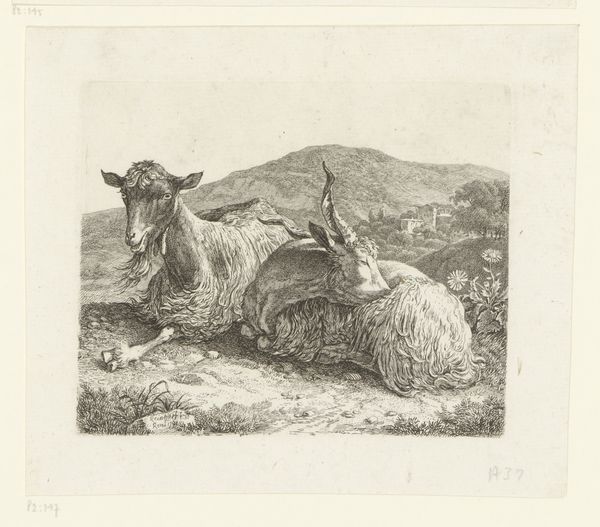 Editor: This etching, "Twee schapen in een weide met hekwerk," by Louis Robbe, dating from 1816 to 1887, depicts two sheep in a field. I find the scene very tranquil. What stands out to you about this work? Curator: Tranquility, yes, but also consider what rural scenes like this were meant to represent. In the 19th century, the romantic idealization of rural life often masked the harsh realities faced by agrarian communities. Does this etching reinforce a comforting narrative, or does it offer a subtle commentary on the relationship between humans, animals, and land ownership? How might ideas of labor and economic disparities filter into the representation of these sheep? Editor: So you're saying the simplicity of the image might be deceptive, hiding complex social issues? I hadn't considered it in terms of labor, or land ownership... Curator: Exactly. The presence of the fence, for instance, speaks to boundaries, enclosure, and control. Consider the implications of depicting animals within a contained space. How might this relate to broader conversations about freedom, confinement, and the commodification of nature, especially viewed through the lens of gender, race, and class dynamics? The sheep themselves—their wool, their meat—were valuable resources. Who benefited from those resources, and at whose expense? Editor: That definitely changes my perspective. I was seeing pastoral beauty, but now I see a loaded scene with potential for discussing exploitation. Curator: It's about critically examining what we’ve been taught to value and whose stories get told, or, in this case, etched into history. The romanticization of nature often occludes the complex realities of lived experience. Editor: I see what you mean. Thanks to this conversation, I feel like I'm not only looking at art but also looking *through* it.