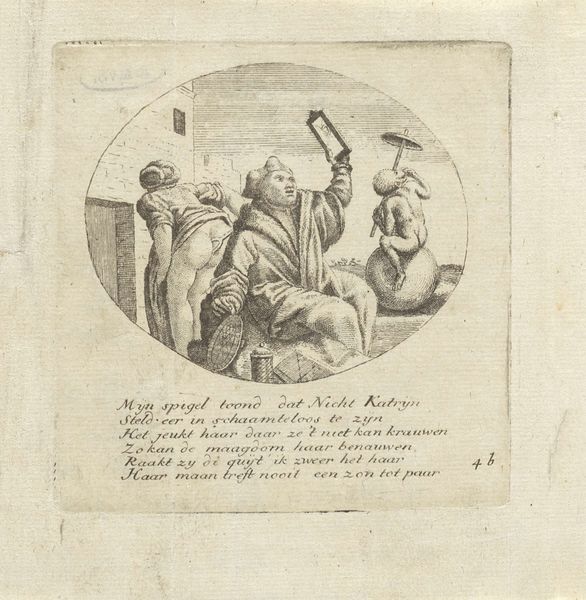 "Allegorisk Gallerie" Nr. 1, an engraving by Georg Fahrenholtz, presents a satirical commentary on societal values, likely made during the late 18th or early 19th century, given the artist's lifespan. The print depicts a woman, adorned with a feathered headpiece and elaborate dress, offering a bag labeled "10,000 loss" to a devilish figure holding a net. This scene, set against a landscape with a peculiar, face-like structure in the background, evokes a critique of human folly and moral corruption. The figures are rendered in a way that emphasizes their roles as allegorical characters rather than realistic individuals. Through its allegorical presentation, the artwork invites viewers to reflect on the deceptive allure of financial gain and the potential for exploitation. It also underscores how societal structures might prioritize wealth over ethical considerations. The emotional tension is palpable, leaving you to ponder the artist’s message about the delicate balance between temptation and virtue.