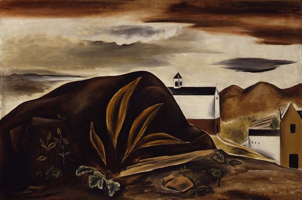 Curator: What a striking image. "Hill," an oil on canvas by Candido Portinari, created in 1933. It seems to depict a favela, a shantytown, climbing a hillside in Brazil, set against a coastal backdrop. Editor: It feels immediately dreamlike, unsettling. The stark, geometric buildings contrasting with the organic, almost fluid hillside and the distant, almost ghostly, city… there's a palpable tension here. Curator: Portinari was a key figure in Brazilian modernism and social realism. He aimed to represent the everyday lives of the working class and the poor. The composition directs our eye upward along the winding path, following the figures. Notice how the path cuts through, almost dominating, the landscape? Editor: The figures, especially those women carrying what looks like water jugs on their heads, recall ancient caryatids. They symbolize burden, resilience. But those cubic houses further up the hill almost look stacked, haphazard, adding to the unstable feeling. It's as if the modern encroaches on a more ancient way of life. And that isolated building, apart from all of the rest? Is it a government building looking over its domain? Curator: That's an insightful point. These communities often lacked basic infrastructure, like running water, which informs your symbolic observation about the jugs. The painting's title, “Hill," seems almost understated, considering the powerful visual narrative about socio-economic realities Portinari presents. His paintings gave a public voice to the marginalized, reflecting the growing social awareness in Brazil at the time. He later went on to have his artwork used as political statements of nationalism by Brazil. Editor: It's fascinating how Portinari simplifies forms – those almost cubist buildings and the simplified figures – yet conveys such complexity and humanity. The muted tones, dominated by that reddish-brown earth, further amplify the weight of the scene. It’s a portrait of survival, etched into the very land. Curator: Absolutely. It makes me consider how artistic expression reflects broader societal challenges. It gives an opportunity to understand Brazilian socio-political history during that era. Editor: It’s more than a historical record though. It is also about continuity and human effort and hardship being transferred through time via these easily understood symbols. It’s a scene imbued with a timeless quality that continues to resonate. Curator: Indeed, its potency lies in its blend of social commentary and artistic vision. Editor: Leaving us to contemplate our place in society’s stratified landscape.