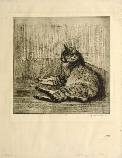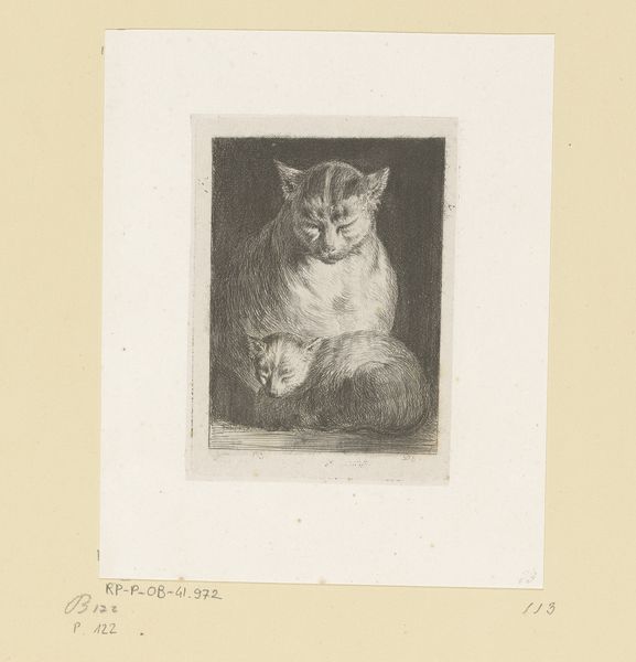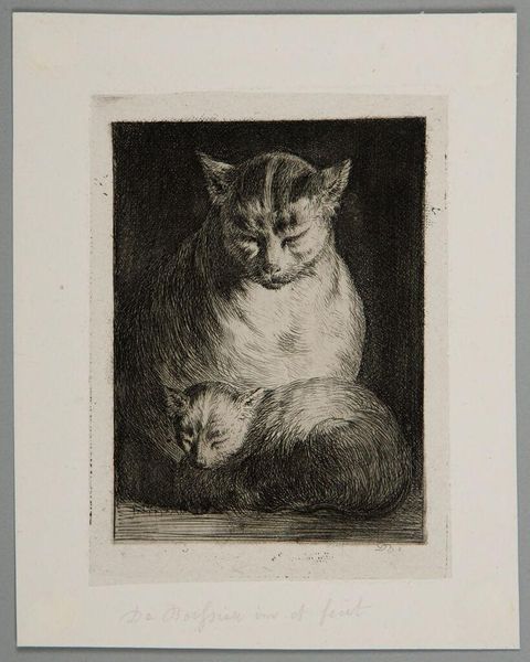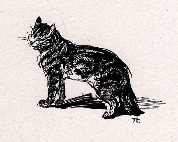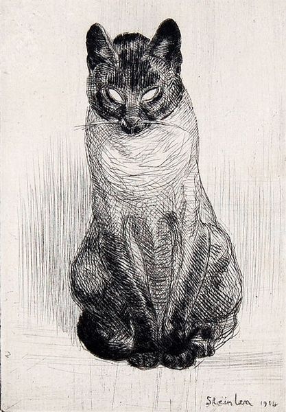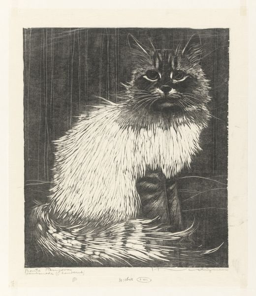 Curator: Ruth Mary Hallock’s “Cat” is a striking woodcut, currently residing in the Harvard Art Museums. What are your immediate thoughts? Editor: The high contrast immediately grabs attention. The stark black and white emphasizes the cat’s penetrating gaze. It feels both intimate and a little unsettling. Curator: I find it interesting how cats, even in artistic representations, have been entangled with notions of domesticity and the uncanny. The very graphic nature of the woodcut lends itself to that tension, don't you think? Editor: Absolutely! The sharp lines contribute to a sense of alertness, almost suspicion. Cats have long been symbols of both independence and mystery, qualities perfectly captured here. Curator: A telling reflection on our complex relationship with the animal world, wouldn't you say? Editor: It does make one consider those enduring cultural associations we have with felines and what they tell us about ourselves.