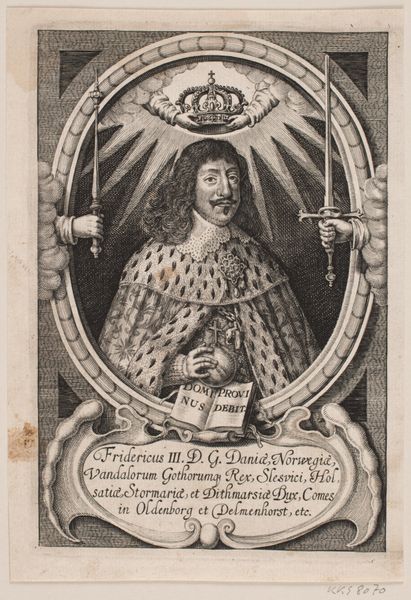 Curator: Ah, there’s an engraving that immediately throws me into a bygone era, almost austere, yet possessing a hidden dramatic flair. Editor: Baroque royalty with divine lighting, eh? Gives me a theatrical feeling. It’s all stark contrasts, with hands from heaven handing her a crown. Heavy stuff, literally and figuratively. Curator: Precisely! This is a portrait of Dronning Sophie Amalie, Queen Sophie Amalie. Created sometime between 1648 and 1656 by Hans Andreas Greys. An interesting case, this work blends Baroque drama with, I feel, a burgeoning focus on individual identity typical of portraiture from this period. The inscription spells out her many titles. Editor: The details in that crown are incredible given the medium, but something about the pose, the set jaw, and the prayer hands from above seems to scream, "burden." Royalty, am I right? Curator: Without a doubt! The placement of the crown above her head by what looks like divine hands, signifies her divine right, an important aspect of royal iconography. Editor: "En Dieu Mon Esperance," the motto says... “In God is my hope.” Makes sense given the hovering hands. This engraver knew their symbolism. It also has the cold touch of dynastic ambition, and not necessarily spiritual illumination. I’m being a touch cynical, maybe? Curator: Cynical, perhaps insightful. Power is a complicated matter and visual representations like these always navigate between genuine belief and political statement. Look at the frame within a frame—the ornamentation seems almost aggressive, designed to both contain and elevate the subject. Editor: You're right, it’s a carefully constructed cage! And it reminds me of how our image of historical figures is inevitably mediated, framed and reframed by those in power. Curator: So true, so true. It's a complex dialogue across centuries isn’t it? I keep seeing her and asking "Who are you behind all that?". Editor: Leaving us to sift through symbols and inherited stories to find, perhaps, a ghost of truth, right? A compelling quest.