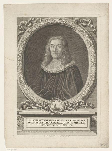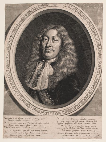 Johann Alexander Böner created this print of Samuel Stryk. The portrait exists within a cultural moment deeply shaped by the Enlightenment, where the status and identity of individuals were often communicated through carefully constructed visual representations. Stryk, a professor, is portrayed not merely as an individual but as a figure of authority and intellect. The Latin phrases around the portrait, speak to Stryk's intellectual promise and the habitation of wisdom within him. Consider the emotional weight of portraying someone in such a formal manner. Böner's work elevates Stryk to an almost idealized status, reflecting the societal values placed on education and scholarly achievement. The piece is more than a likeness; it's a statement about the kind of people society chooses to honor and remember.