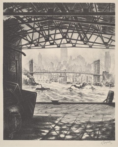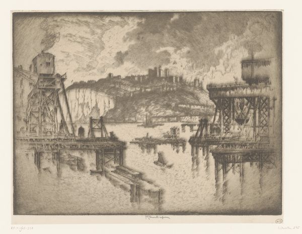 Joseph Pennell made this print, Under the Bridges, probably in the early 20th century, using etching to create an image of industry and infrastructure. Pennell's lines swarm across the surface, depicting a complex network of bridges and smokestacks. It's a process of accumulation, of layering marks to build form and atmosphere. Look closely, and you can see how the etched lines vary in thickness and density, creating a sense of depth and texture. In the lower part of the image, where the water reflects the surrounding structures, the lines are more chaotic, almost vibrating with energy. This reflects the industrial scene but it's also about the surface of the metal plate itself, and how the acid bites into it. Pennell was clearly inspired by Whistler's prints, but he brought his own vision to the medium. Like Whistler, Pennell embraced ambiguity, inviting us to lose ourselves in the details and discover new connections.
