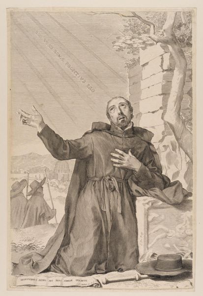 Curator: Here we see Jan Lievens' etching from 1625-26, "Jakob zalft de steen waarop hij geslapen heeft," or "Jacob Anointing the Stone Upon Which He Slept." Editor: It feels stark, somehow. The starkness of the black lines on the white paper lends this work to have a sacredness to it. Like something essential has been laid bare. Curator: Well, etching, as a printmaking process, is really interesting in how it renders line. Acid is used to bite into the metal plate. It's an indirect process and there is always a tension between the artist's hand, the tool and the final product that I feel really connects with spiritual practices. Editor: I am intrigued with this, and this stone. A rock that becomes sacred. Is there a transformative process that art shares with that idea? Something ordinary becoming holy with artistic skill? Curator: It raises interesting questions about materiality and meaning. Labor too: how did the social context surrounding printmaking at the time this piece influence both its dissemination, as well as interpretation? Was Lievens attempting to reach a wider audience with biblical scenes than a painting in an elite collector’s home could reach? Editor: Definitely makes one consider accessibility, doesn't it? Etching as an endeavor that democratizes art. In what ways can this inform our views about contemporary mediums as well, like digital art. Is art more transformative when more hands can touch it? Curator: Or even minds perceive and interpret it, definitely. What materials and processes are considered to carry artistic merit, and who decides? Those questions can guide us back to Lievens’ original etching in a loop. It all circles back! Editor: A good way to circle, reflecting both on artistry and its reach. Thank you.