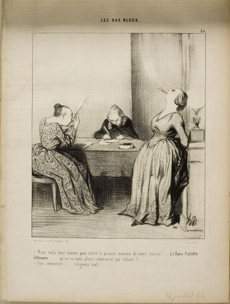 Curator: Daumier's lithograph, "...must they curse me/ These cruel parents...", presents a pointed critique of bourgeois values through a domestic scene. Editor: It feels suffocating, doesn't it? The young woman elevated, almost trapped, while the older women watch with expressions I can't quite decipher. Curator: Exactly. Daumier uses caricature to highlight the tension between artistic aspiration and societal expectations for women in 19th-century France. Her dramatic pose, the theatrical lighting, it's all performance. Editor: I see the echoes of classical statuary in her pose, yet the overall effect is comedic. The bunched fabric beneath her feet is also a fascinating detail. Curator: The print underscores the limitations imposed on women's self-expression, particularly those seeking intellectual or artistic pursuits. It's a clash of generations and ideals. Editor: It is powerful how Daumier invites us to ponder the historical constraints, while also hinting at the timeless struggle for individual liberation.