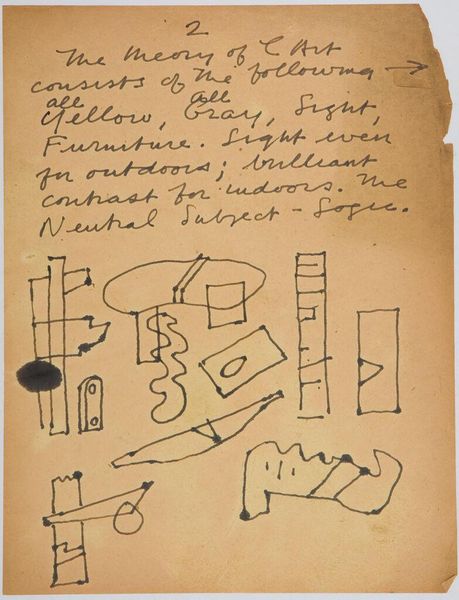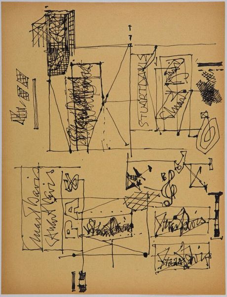 Editor: This is Stuart Davis's "Art Theory Text with Sketches," housed at the Harvard Art Museums. It’s just lines and shapes with text, almost like a visual code. What do you see in this piece? Curator: It’s like glimpsing the raw symbols of Davis’s mind. The text hints at a desire for art beyond political constraints, while the sketches resemble glyphs, each potentially carrying a specific, personal significance. Do you see any recurring forms? Editor: I notice the rectangles and curves. Is he trying to invent his own visual language? Curator: Precisely! He's forging a symbolic vocabulary. These shapes likely recur in his paintings, functioning as building blocks of a personal iconography, informed by the cultural landscape he inhabited. Editor: So, it's like a key to unlocking his other works? Curator: In a way, yes. This page allows us to see how an artist creates meaning through symbols. Editor: It’s fascinating how something so abstract can reveal so much!